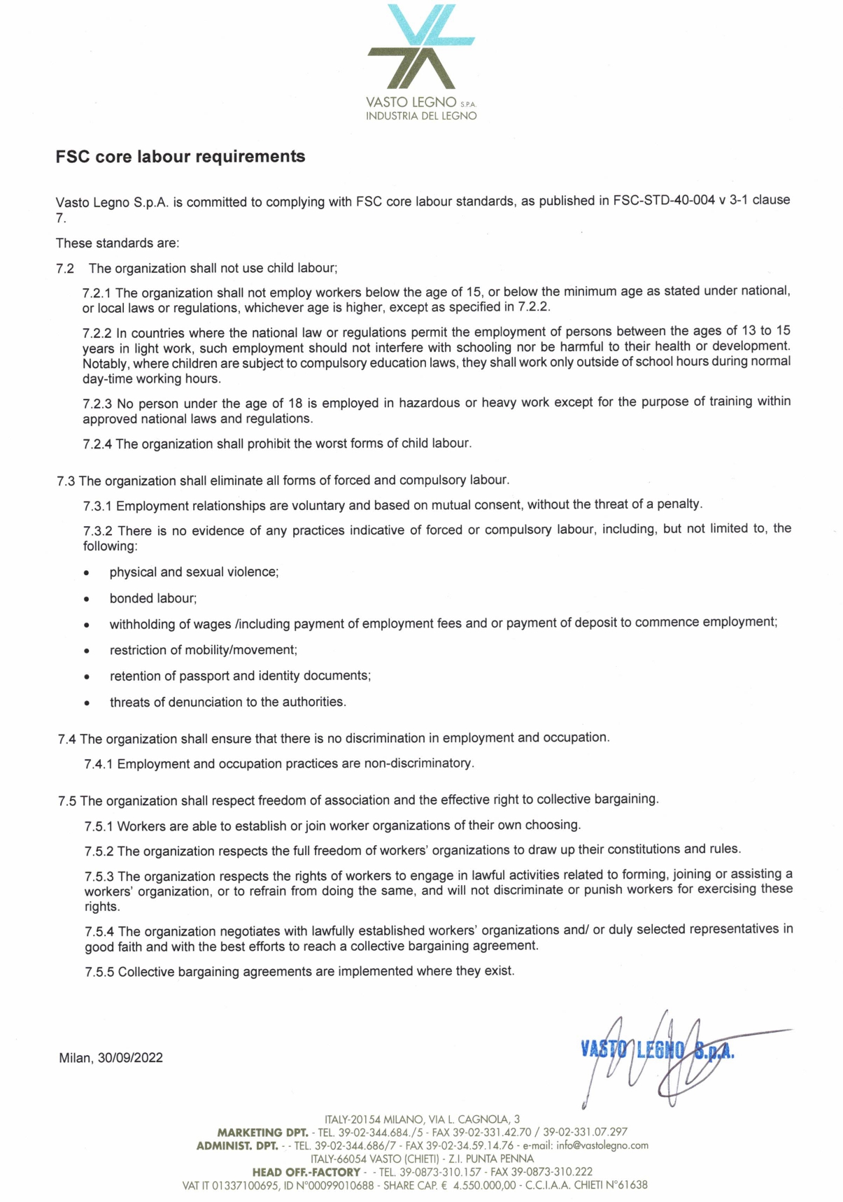 This document guarantees compliance with FSC Core Labour Requirement by Vasto Legno Spa