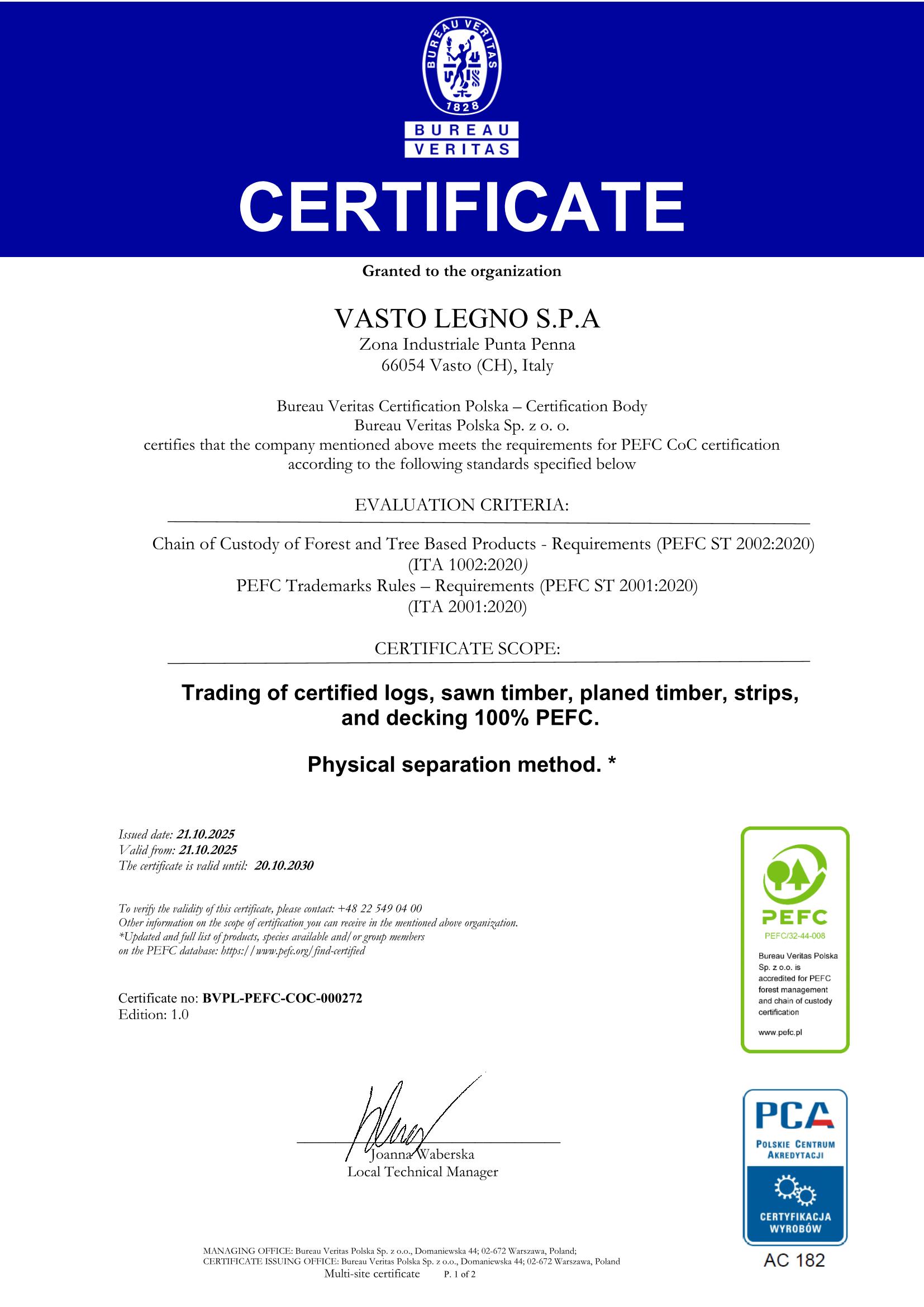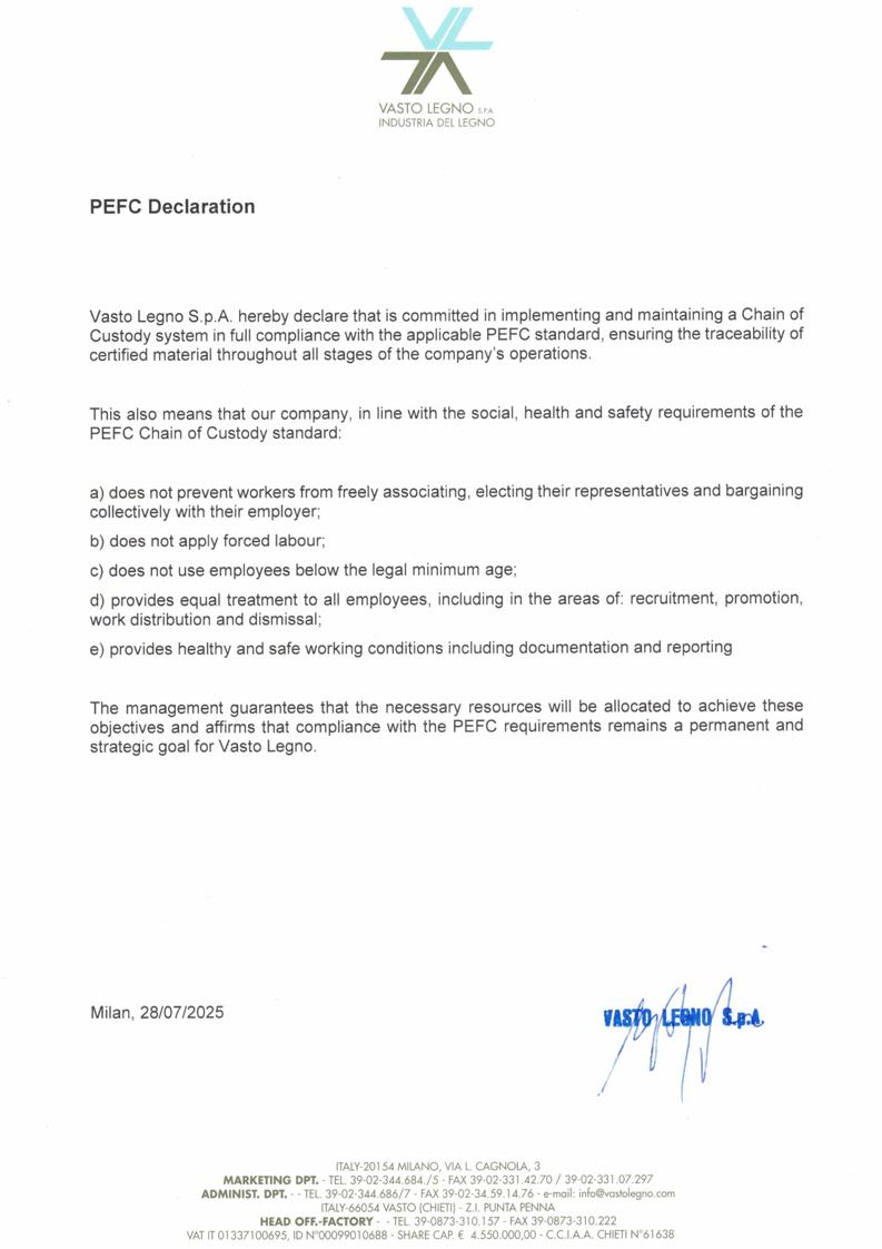 This document guarantees compliance with PEFC Requirements by Vasto Legno Spa